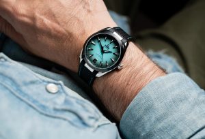 The gorgeous dials start off with a bright and fresh turquoise in the centre, fading out into a much darker area towards the edges, which in some lights even stretches out into a deep black. This is contrasted by a bright turquoise minute track and is interrupted by grey PVD-treated and diamond-brushed indexes, filled with white Super-LumiNova. The hands also feature the same treatment. This darker dial furniture matches an applied PVD-coated Omega logo and a darkened date window at 6 o’clock.